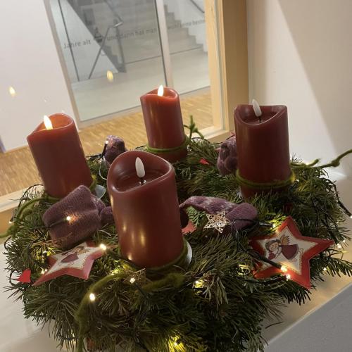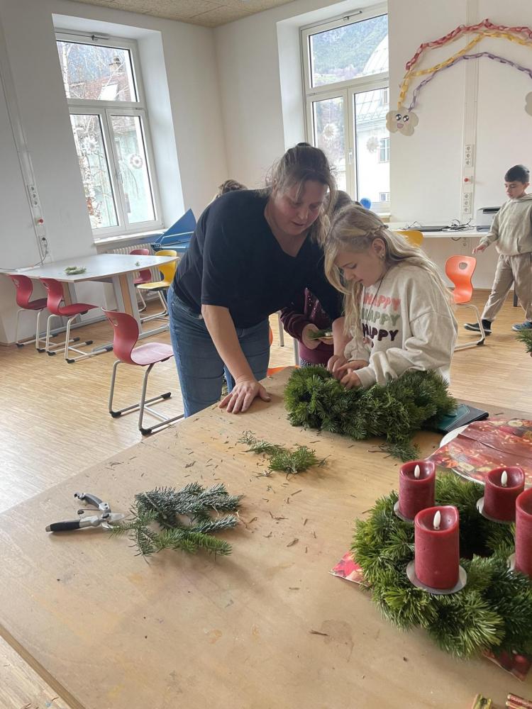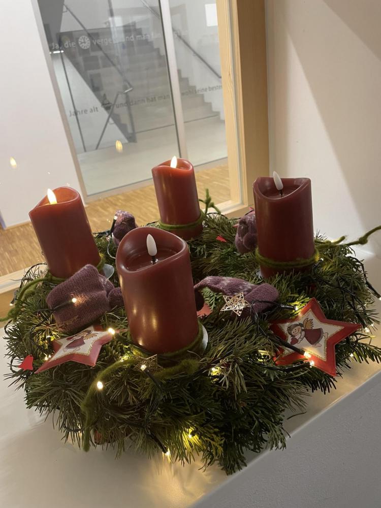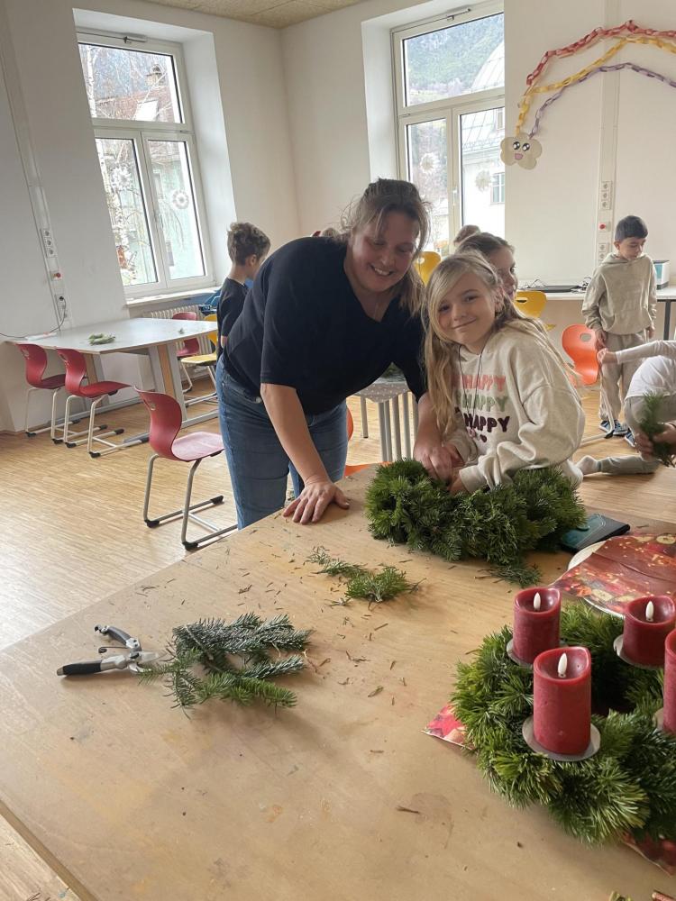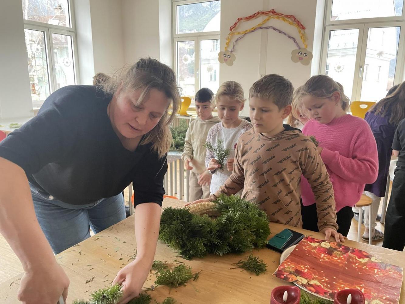 Vielen Dank, liebe Gerlinde, dass du dir wieder Zeit für uns genommen hast. Im Werkunterricht durften wir zwei wunderschöne Adventskränze mit dir binden und schmücken. Einer befindet sich in unserem Klassenzimmer, der andere erfreut unsere Schüler:innen, Lehrer:innen und Besucher:innen am Haupteingang.