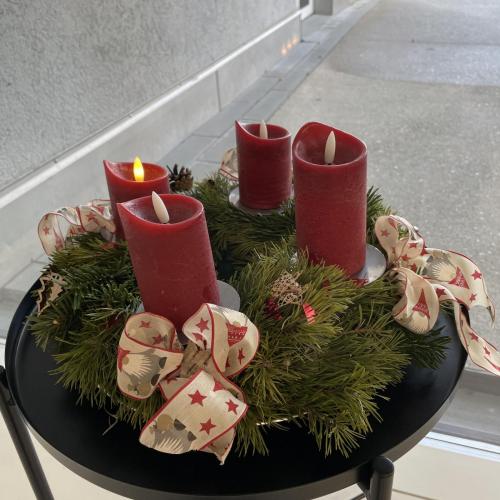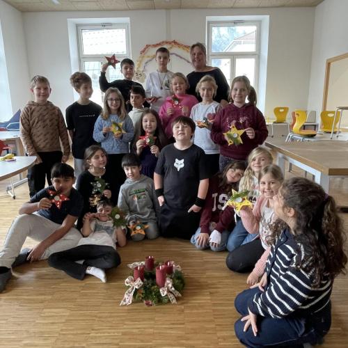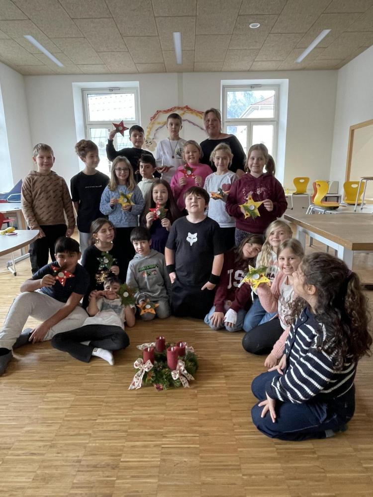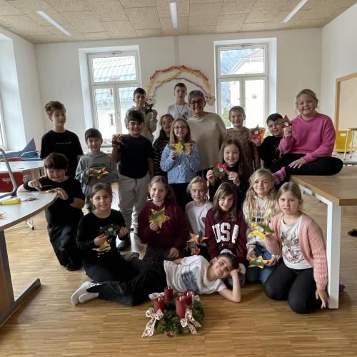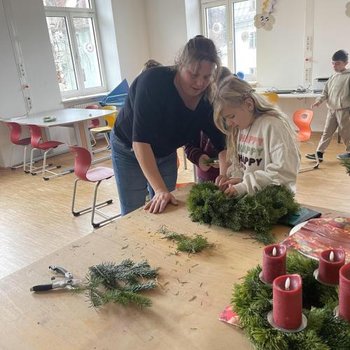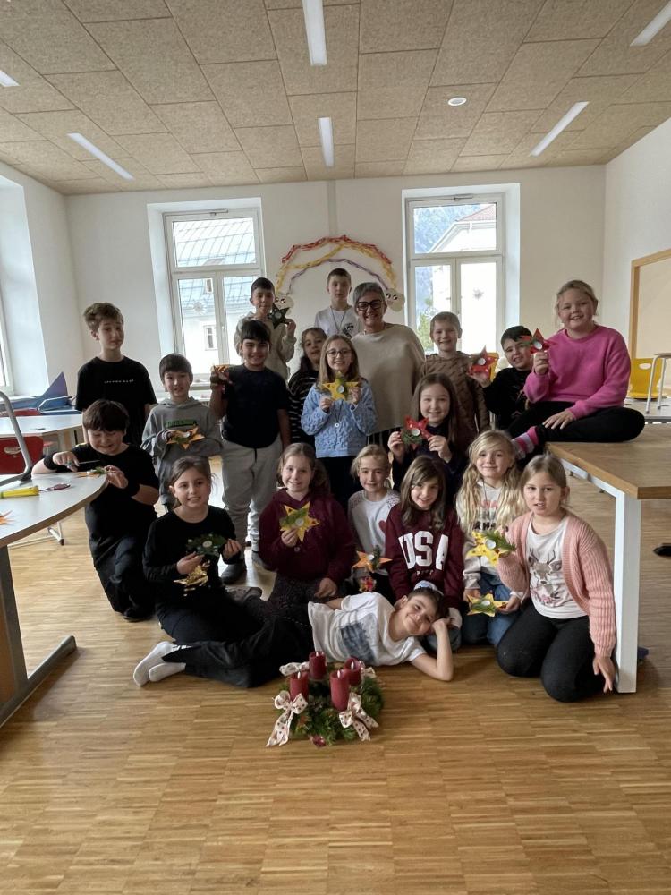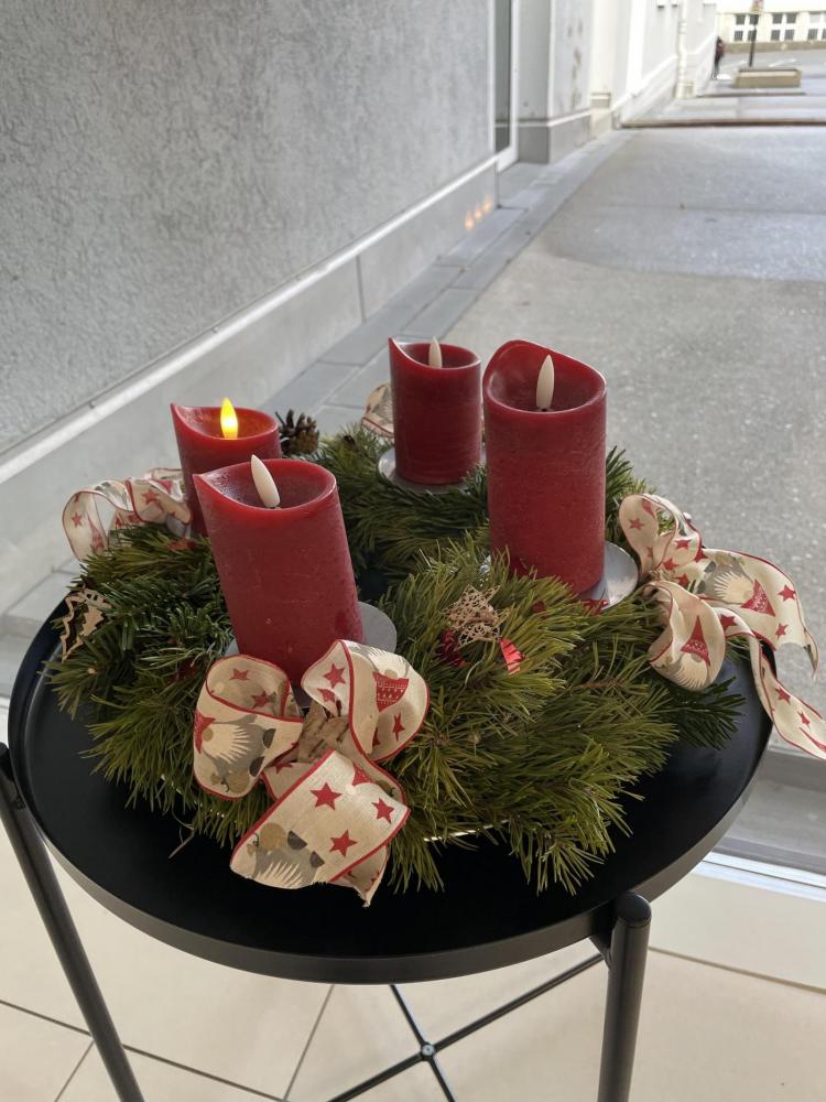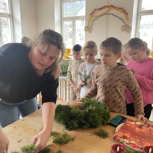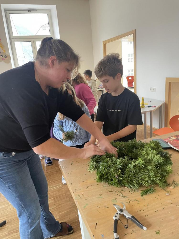 Vielen Dank, liebe Gerlinde, dass du dir wieder Zeit für uns genommen hast. Im Werkunterricht durften wir zwei wunderschöne Adventskränze mit dir binden und schmücken. Einer befindet sich in unserem Klassenzimmer, der andere erfreut unsere Schüler:innen, Lehrer:innen und Besucher:innen am Haupteingang.