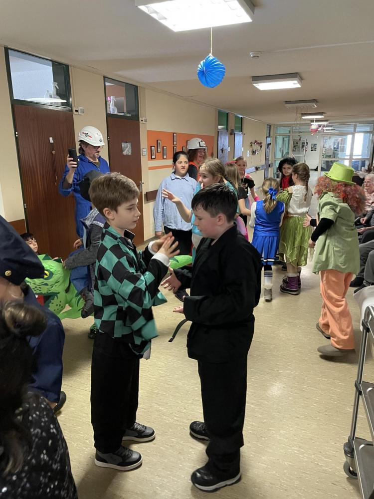 Mit einer fröhlichen Polonaise zogen die Schülerinnen und Schüler in die Aufenthaltsräume ein und stimmten gleich darauf ein schwungvolles Faschingslied an. Danach folgten bekannte Bewegungslieder – vom Ententanz bis zum Fliegerlied – bei denen nicht nur die Kinder, sondern auch viele Bewohner:innen begeistert mitmachten oder im Takt mitklatschten.